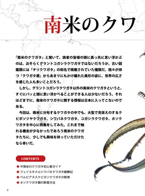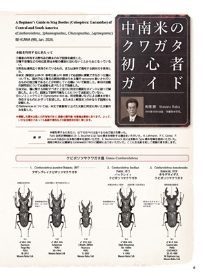 「日本人には馴染みの薄い=よくわかっていない」 であろう中南米に分布するクワガタの中でも、大型で派手なクビボソツヤ、シワバネ、コガシラ、ホソを中心として特集を組みました。巻頭図説にはこれらの種に造詣の深い馬場勝氏に解説の依頼をし、国内の出版物では初掲載となる種も含めて多数の標本を紹介しています。