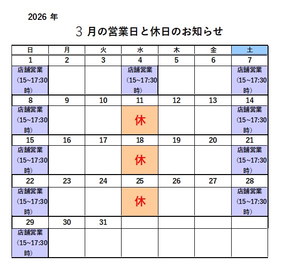 店舗営業日時: 毎週 水曜・土曜・日曜 15時 〜 17時30分