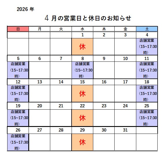 2026年4月の店舗営業日は以下の通りとなります。