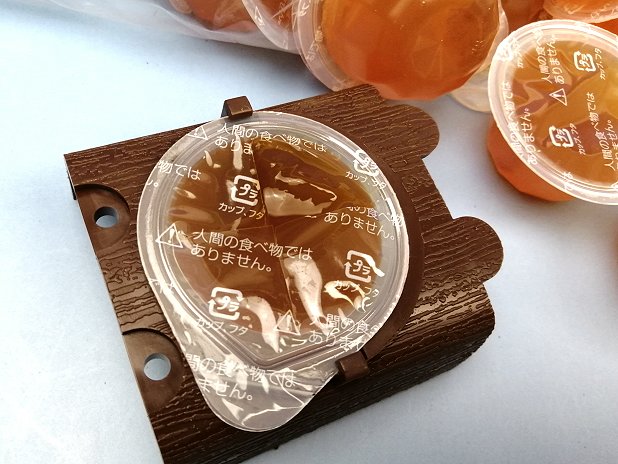 ゼリーの作りがやわらかく、カップから出やすいため、フィルムを全部剥かず、カッターなどでフィルムを十字に切って与えるとよろしいかと思います。